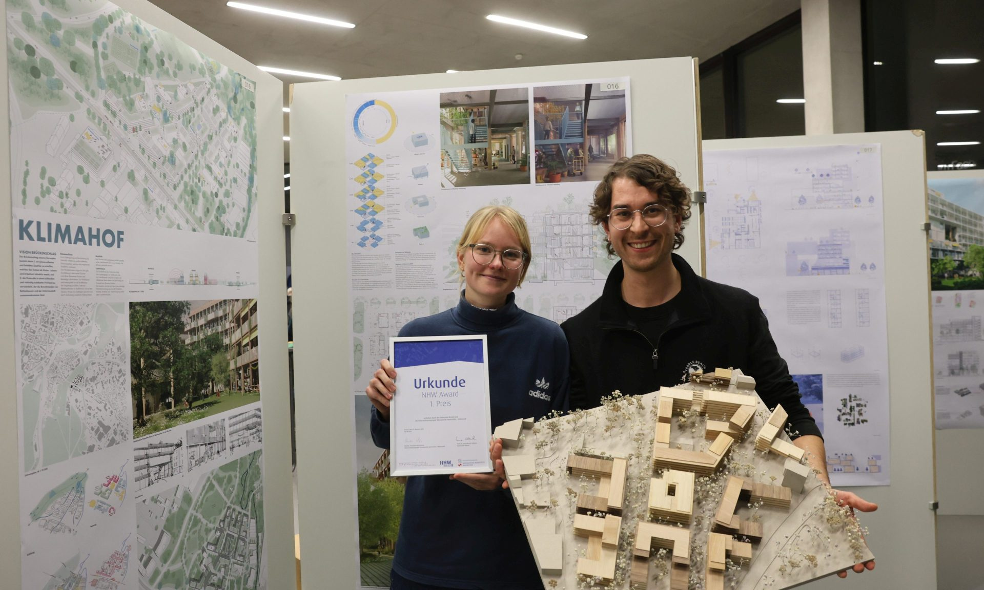 Komplexe Aufgabe gut gelöst: Elina Klett und Tom Stehmann belegten mit ihrem Projekt Klimahof einen der beiden ersten Plätze. Foto: NHW / Andreas Fischer